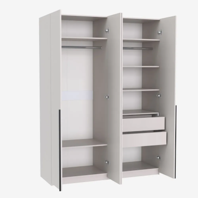 Распашной шкаф имеет 4 дверцы с 2 длинными профильными ручками. За двумя левыми дверями расположена антресольная полка сверху, отсек для хранения внизу, платяной отсек с горизонтальной штангой во всю длину. За двумя правыми дверями расположено: 2 выдвижных ящика, укороченный плательный отсек с горизонтальной штангой во всю длину, антресольная полка и отсек для хранения внизу. Комбинированная модель позволяет использовать её сразу в качестве плательного и бельевого шкафа, где можно разместить гардероб, одежду, белье, обувь и другие вещи.